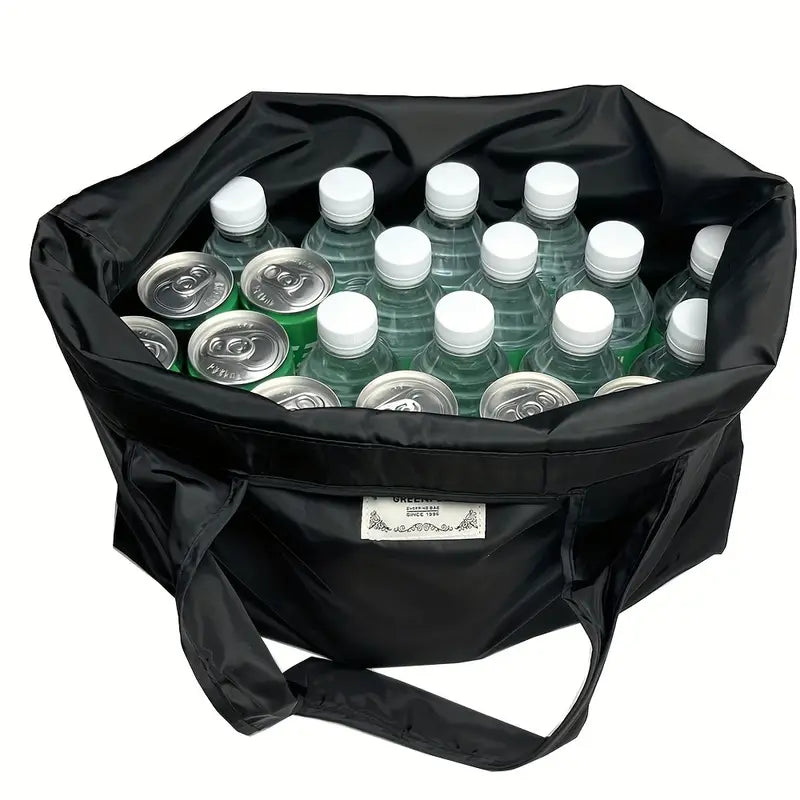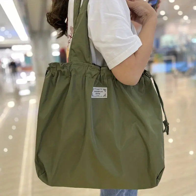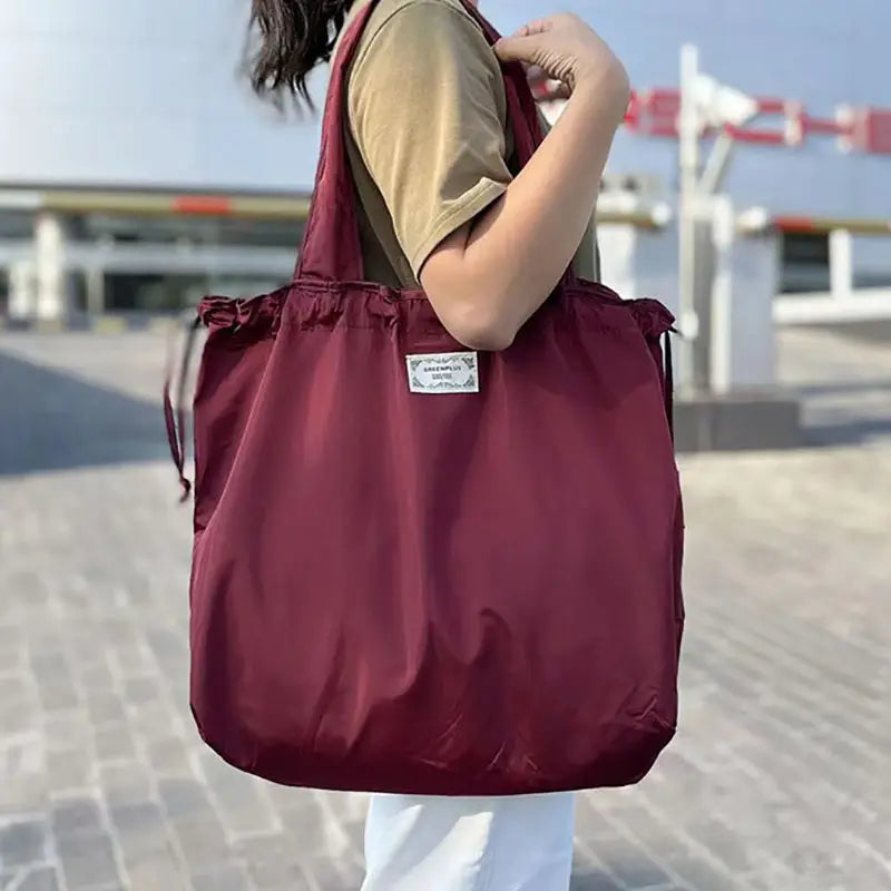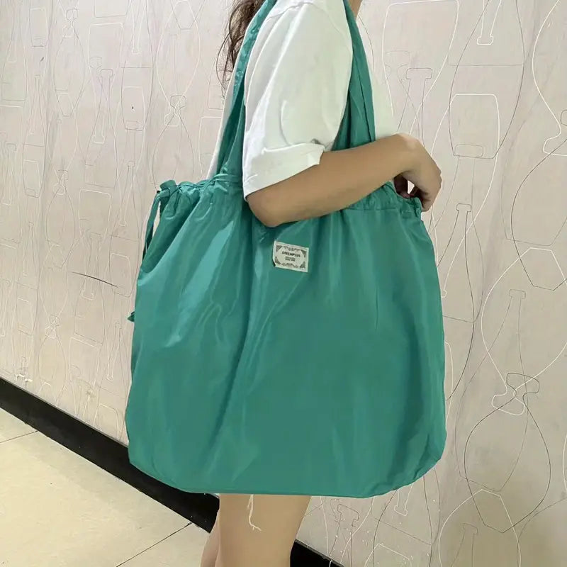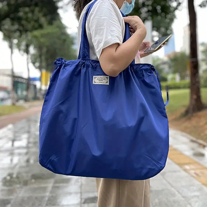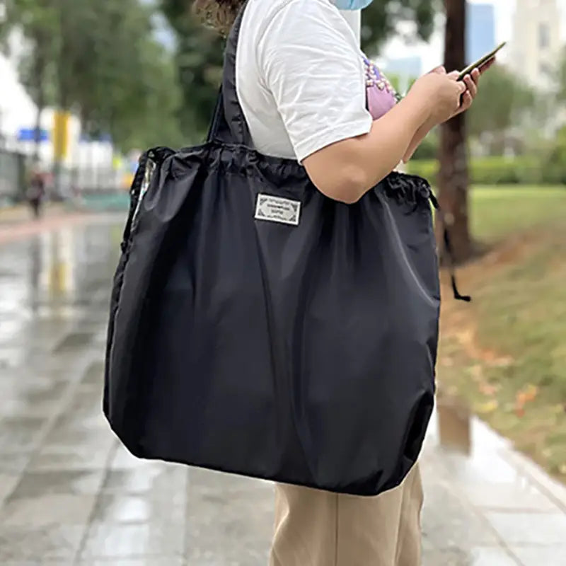 Der praktische Kordelzug-Verschluss schützt den Inhalt sicher, während die breiten Schulterriemen angenehmen Tragekomfort bieten. Durch das faltbare Design lässt sich die Tasche platzsparend verstauen – perfekt für unterwegs oder im Auto.