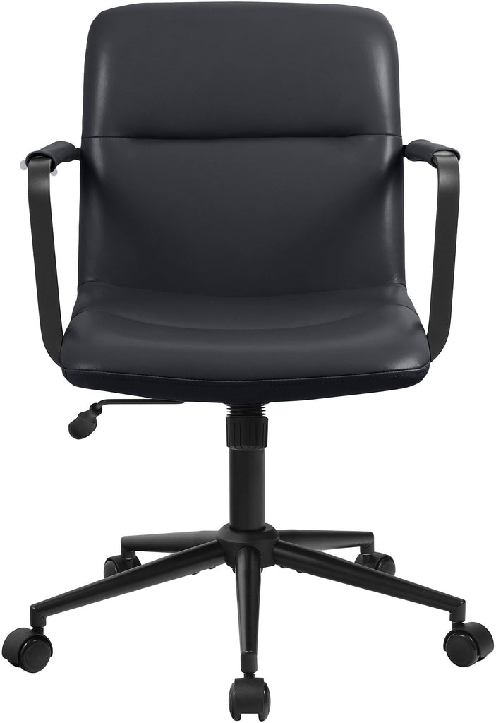 Das stabile Metallgestell in mattem Schwarz sowie eine robuste Gasdruckfeder gewährleisten hohe Langlebigkeit und zuverlässige Stabilität. Die leisen Rollen ermöglichen eine sanfte und flexible Mobilität – ideal für Hart- und Teppichböden.
