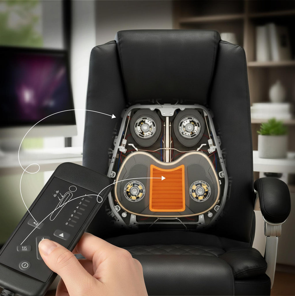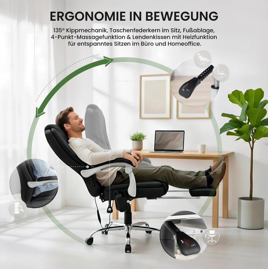 Die integrierte Massagefunktion mit 4-Punkt-System, ergänzt durch ein Lendenkissen und eine Sitzheizung, sorgt für wohltuende Entspannung während der Arbeitspausen. Die Sitzhöhe ist von 47 bis 54 cm verstellbar und lässt sich optimal an unterschiedliche Tischhöhen und Körpergrößen anpassen.